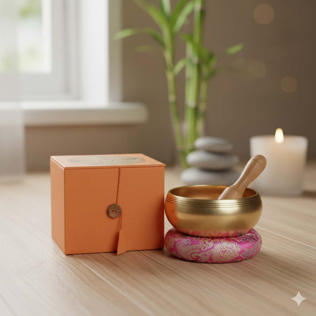 Incluye palo de madera y cojín para cuenco. Presentado en estuche artesano nepalí.