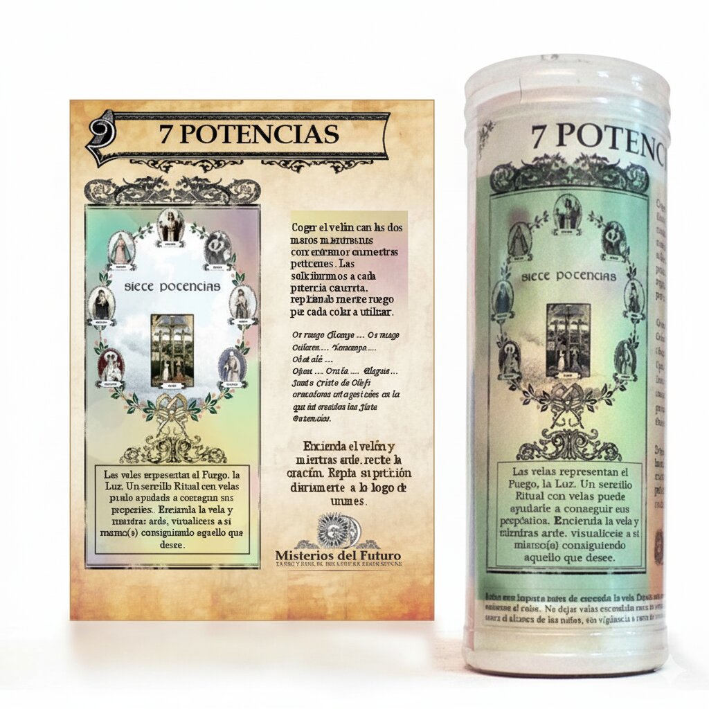 La vela, Velón, de siete potencias se utiliza para desbloquear y aportar energía. De este modo puede limpiar y abrir caminos, así como nivelar el curso energético. Se puede utilizar para realizar sencillos y potentes rituales. Es muy utilizada para potenciar un ritual que ya tenemos en marcha, es decir para ayudar a un propósito ya establecido por otro ritual, apartando su energía vibracional.